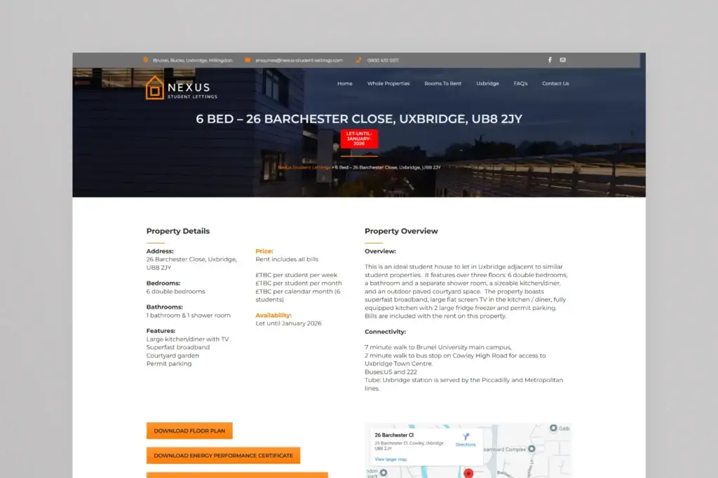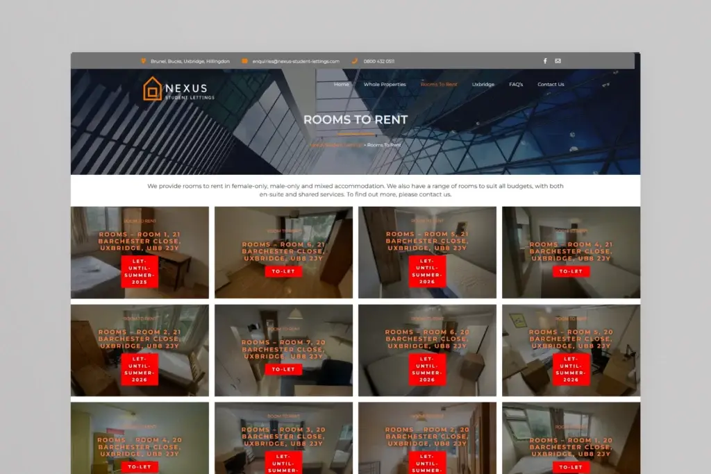Nexus Student Lettings provides accommodation for Brunel University students, requiring a website that streamlines the property search experience while offering a sustainable and secure hosting solution. The platform needed robust property listing functionality with advanced filtering options, allowing prospective renters to browse by room or whole-house occupancy while remaining easy to manage for administrators.
